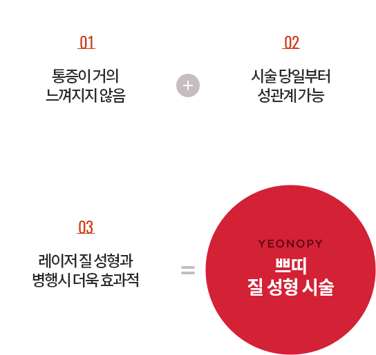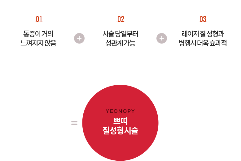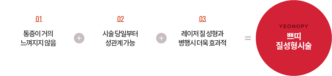 시술 당일부터 통증이 적어 성관계가 바로 가능하며 여노피의 레이저 질 성형술과 병행하는 경우 더욱 효과적입니다.