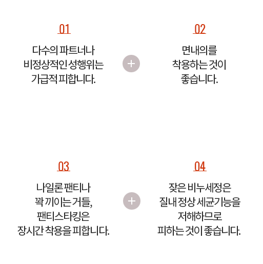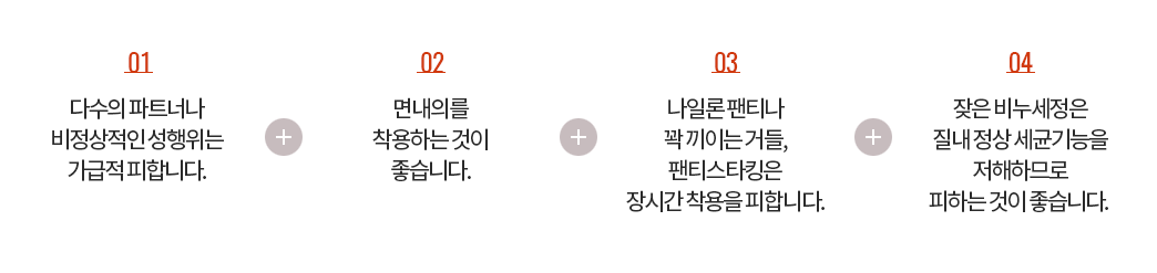 다수의 섹스 파트너를 피하고 생리 중 성관계나 항문 성교와 같은 비정상적인 성행위는 가급적 피하는 것이 좋습니다.