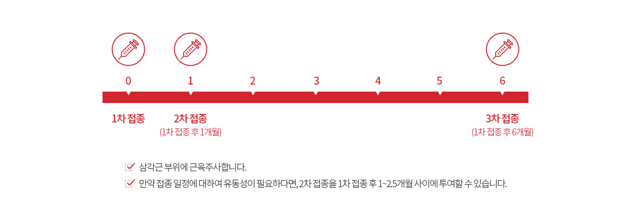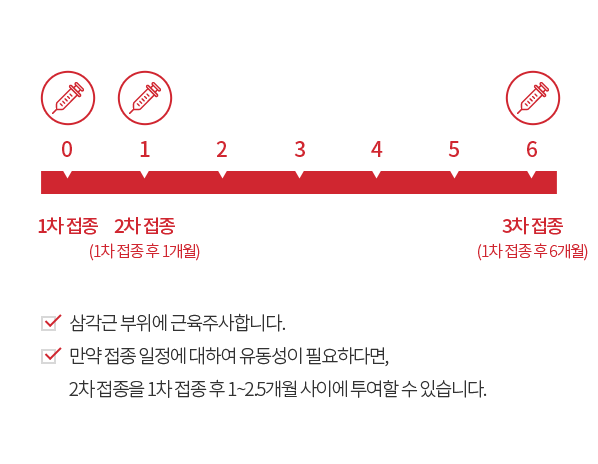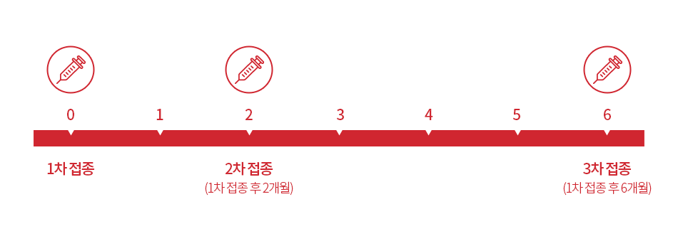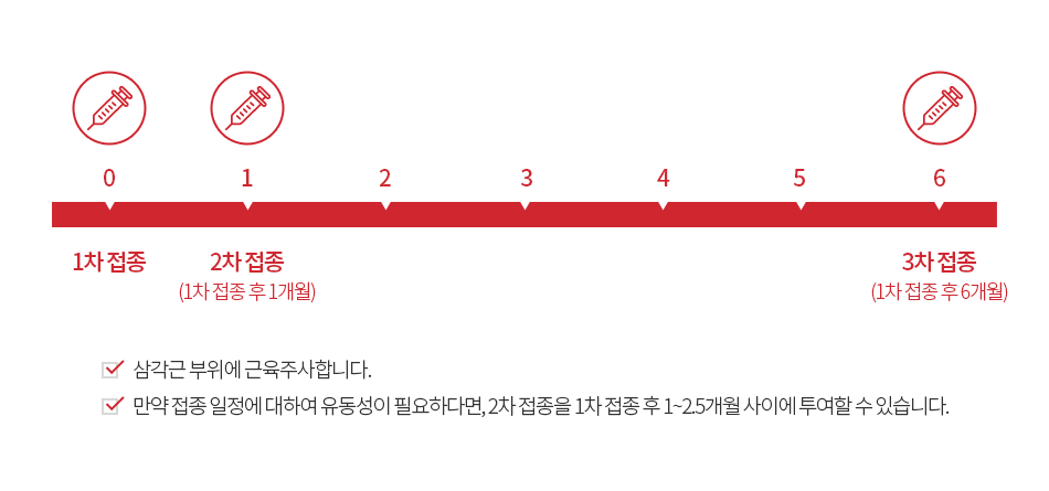 가다실9가 궁경부암 예방백신은 0, 2, 6개월 접종을 기본으로, 2차 접종은 1차 접종 후 1 – 2 개월내에 시행할 수 있으며,